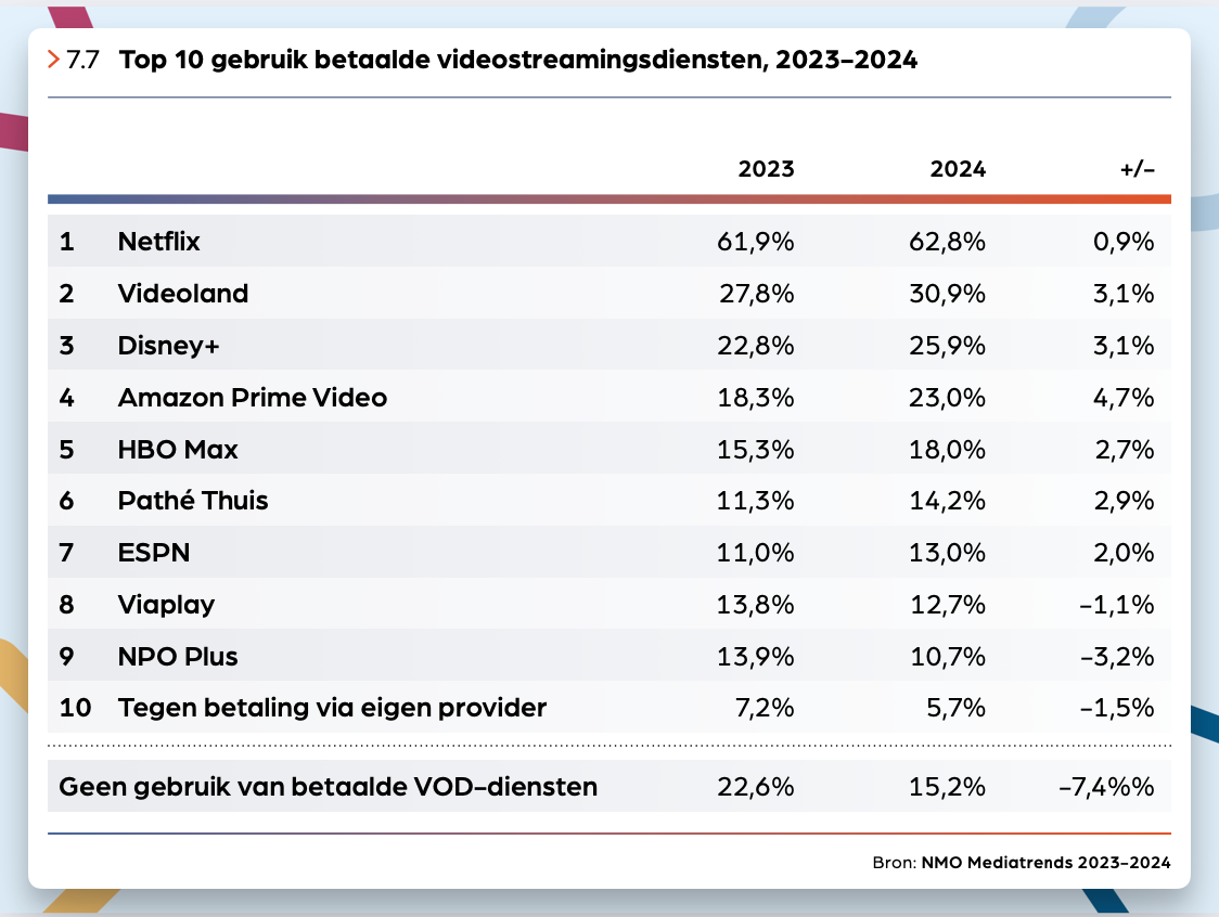 📺 Het aantal Nederlanders zónder VOD-dienst daalde van 23% naar 15%, terwijl het gemiddeld gebruik steeg naar 3,3 diensten per huishouden. Het zou mooi zijn als de advertentiemogelijkheden op deze platformen toenemen in de toekomst.