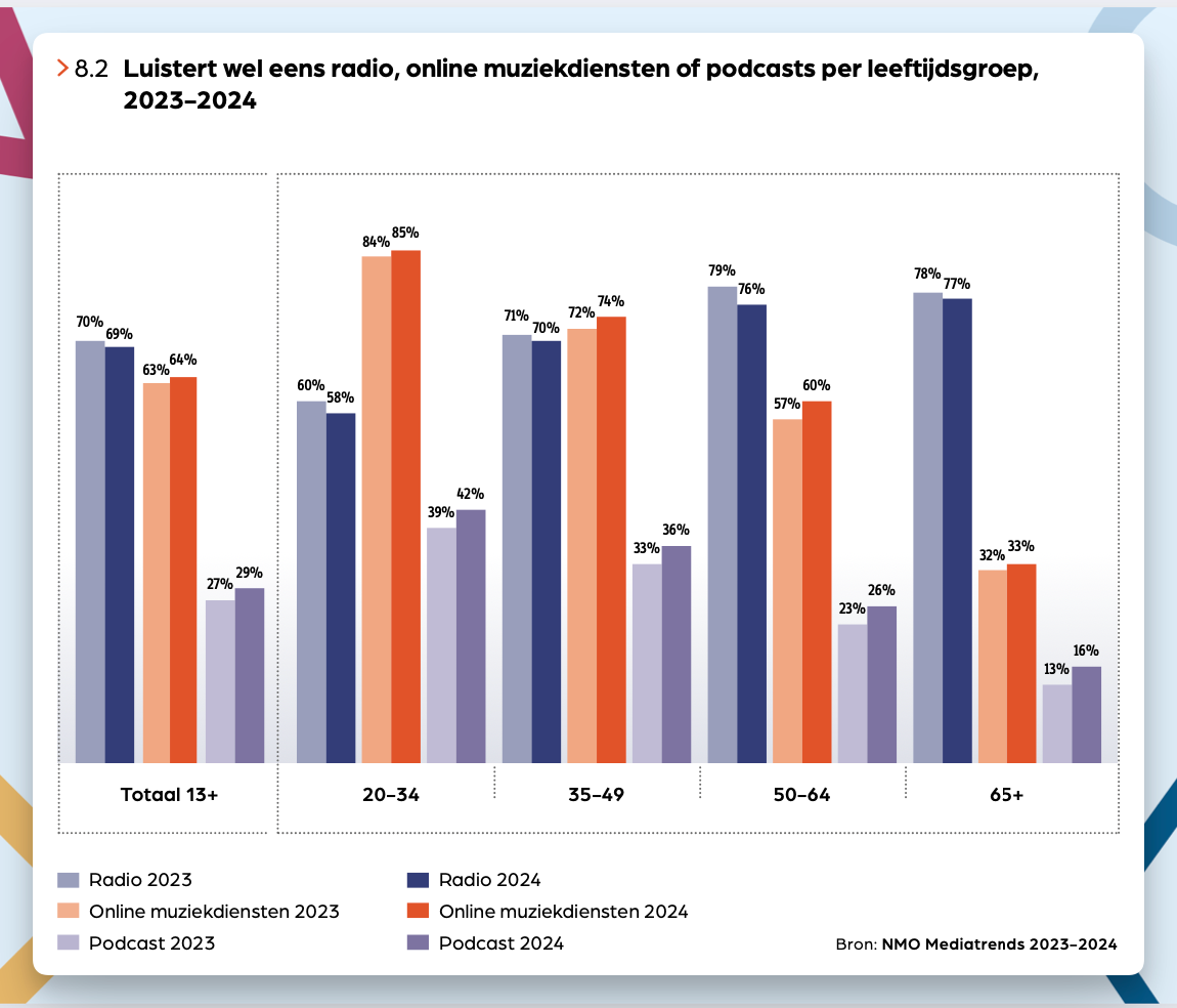 🎧 Podcasts winnen terrein: vooral bij 20-34-jarigen en opvallend ook bij 35-49, waar het gebruik met 3,7 procentpunt steeg. Het luisteren van podcasts gaat ten koste van 't luisteren naar radio.