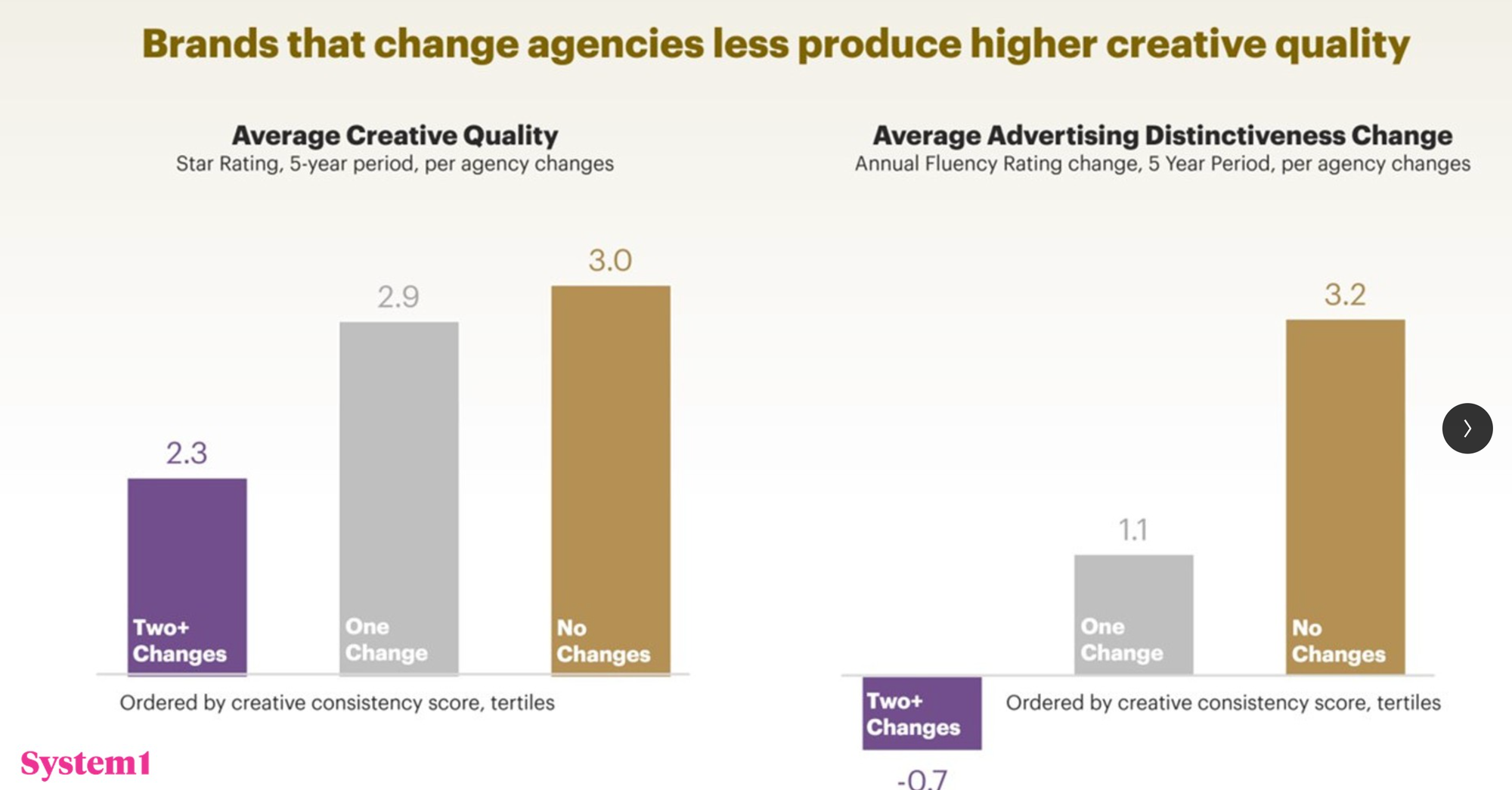 Andrew Tindall van System1 kopt het onderzoek slim in met onderstaande grafiek: effectief werk wordt gedaan door bureaus die lang samenwerken met een klant.
