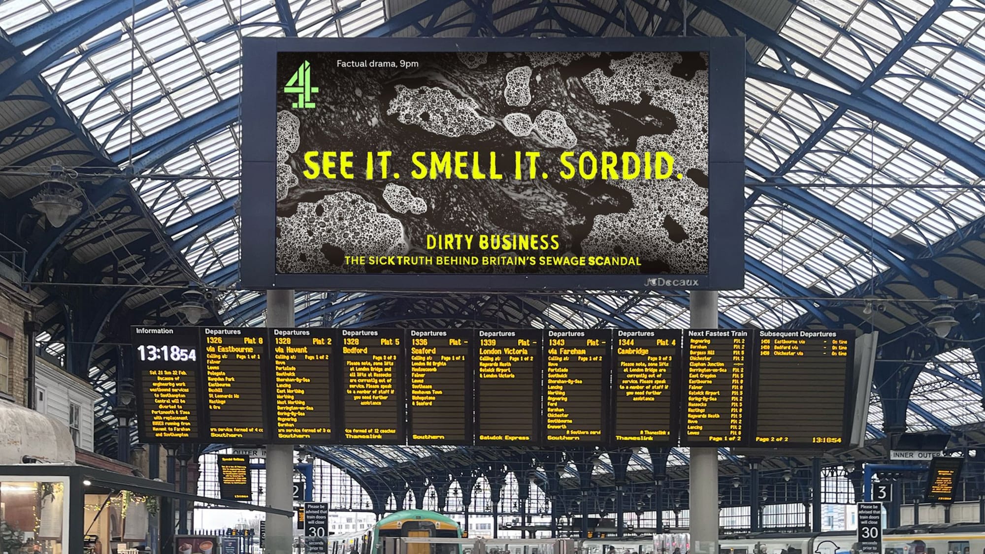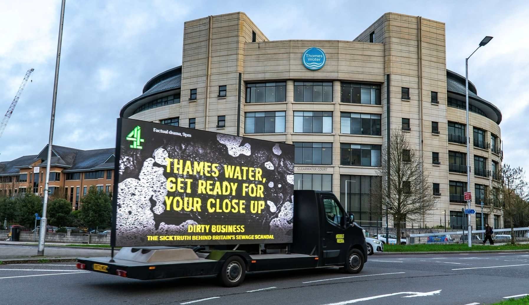 Om het nieuwe Channel 4-programma Dirty Business te promoten, is een opvallende fonteininstallatie gebouwd. De tien meter brede fontein toont bronzen standbeelden van mannen, vrouwen en kinderen die kotsen door 't rioolwater.