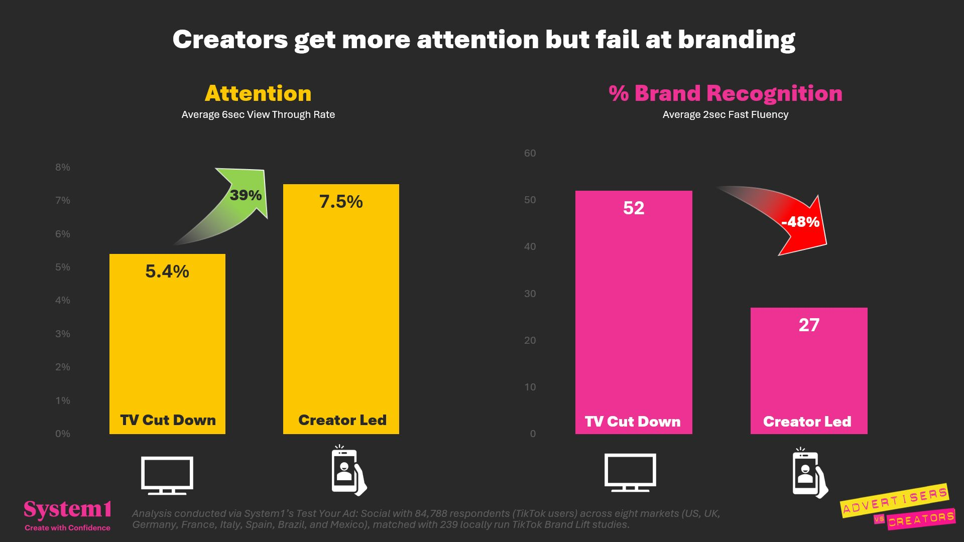 Deze sheet zag ik Andrew Tindall van System 1 posten, maar kwam niet meer terug in het uiteindelijke onderzoek. Vast met een reden: Creators zijn goed in het grijpen van aandacht (de boodschap is vaak minder commercieel), maar zijn een stuk minder sterk in het koppelen aan merkherkenning.