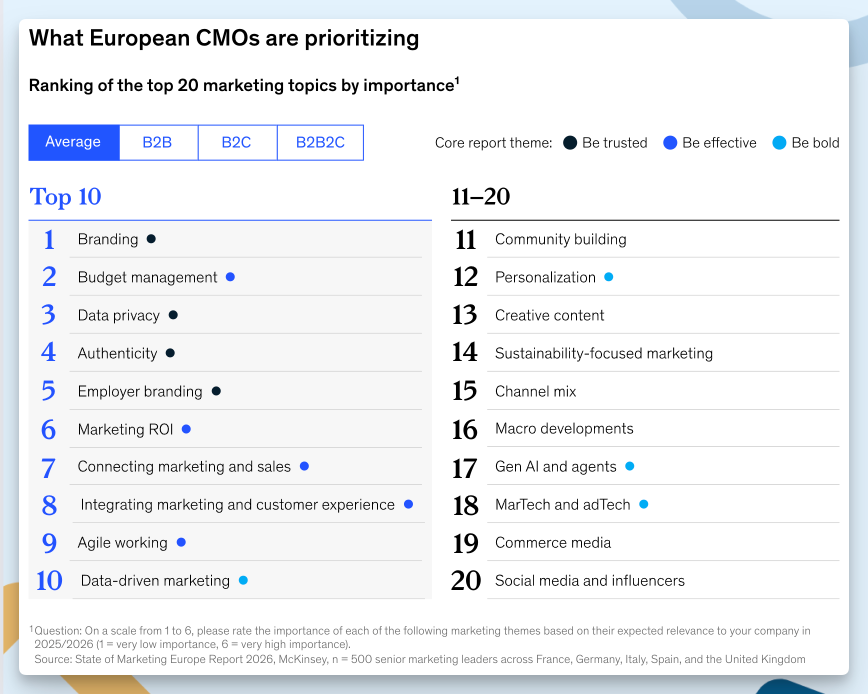 McKinsey analyseerde input van 500 Europese marketingleaders en ziet een duidelijke verschuiving: branding is in 2026 de hoogste prioriteit, boven performance, martech en GenAI.