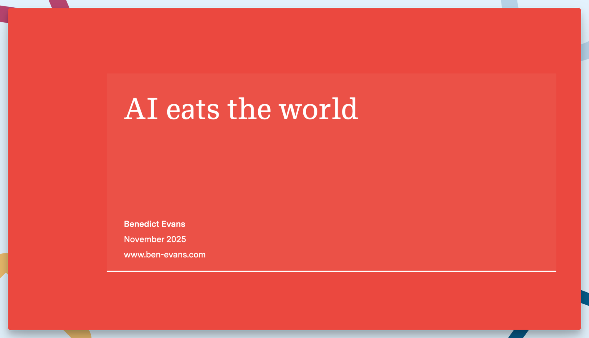 Benedict Evans, tech analist, bouwt twee keer per jaar een herkenbare presentatie over de rol van tech in de wereld. Zijn laatste versie staat in 't teken van, jawel, AI.