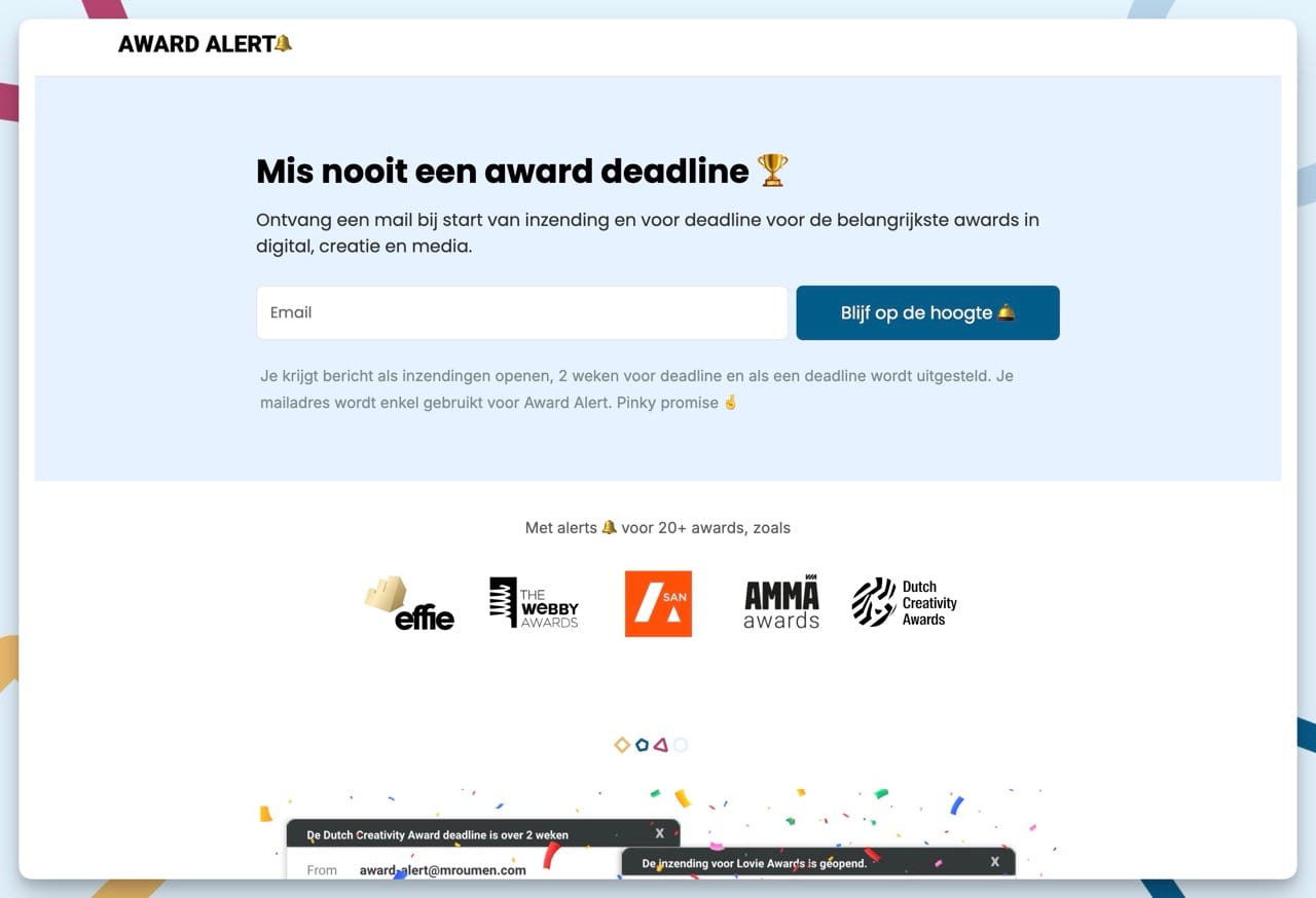 Spoiler alert: veel data zijn nog niet duidelijk. Daarom schrijf je je in voor Award Alert. Krijg je handig een mailtje wanneer er een deadline aan zit te komen.